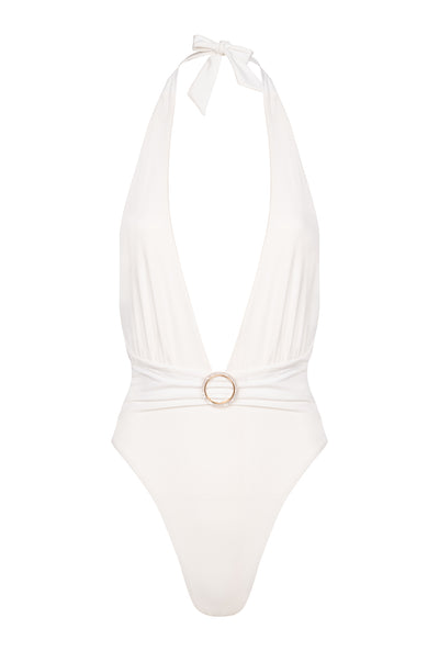 Channel your inner Goddess with this statement one-piece - Designed with a deep V neck front and adjustable neck straps, it’s sexy and classy combined. The Palermo one-piece features a flattering low back with feminine gather details, whilst the waist belt elevates this timeless silhouette with gold / Pearl-like hardware for understated glamour. *Medium -modest coverage at the back.
