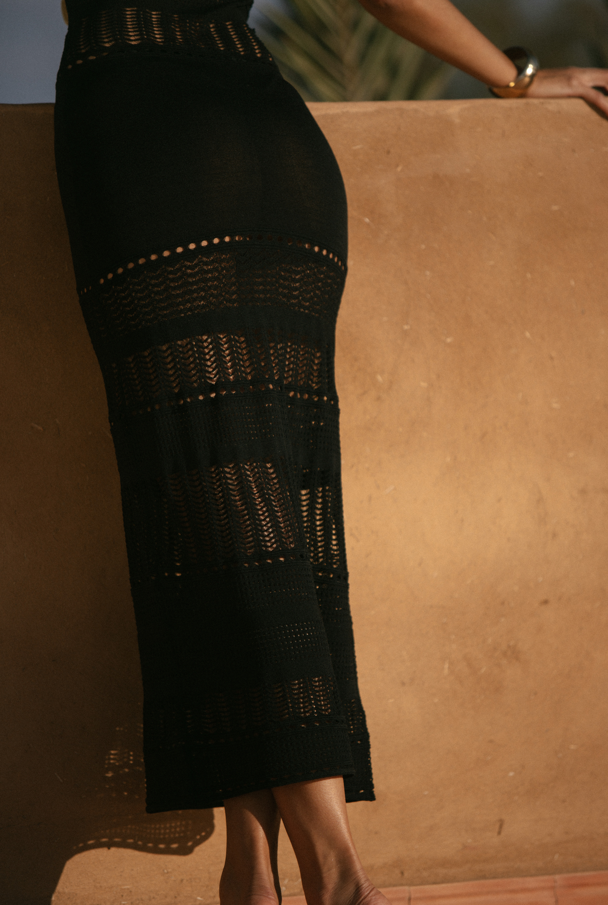 A multi-knit design that effortlessly slips on and hugs your figure. Designed to be less sheer around the bust and hips, this dress is the perfect day-to-night staple piece. Features adjustable neck ties and a low back design. Can be styled over a bikini top as a coverup or without as a stand-alone dress.