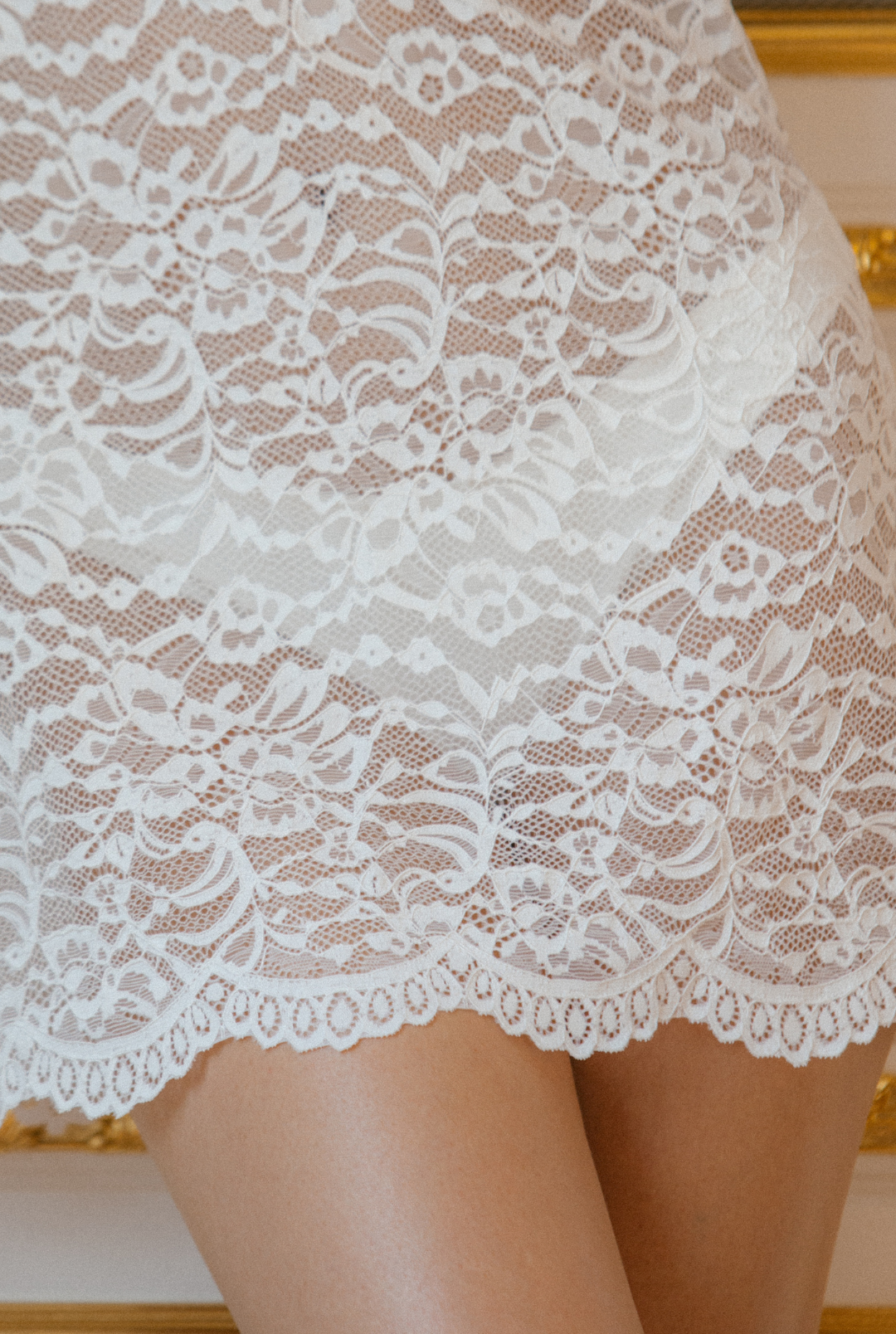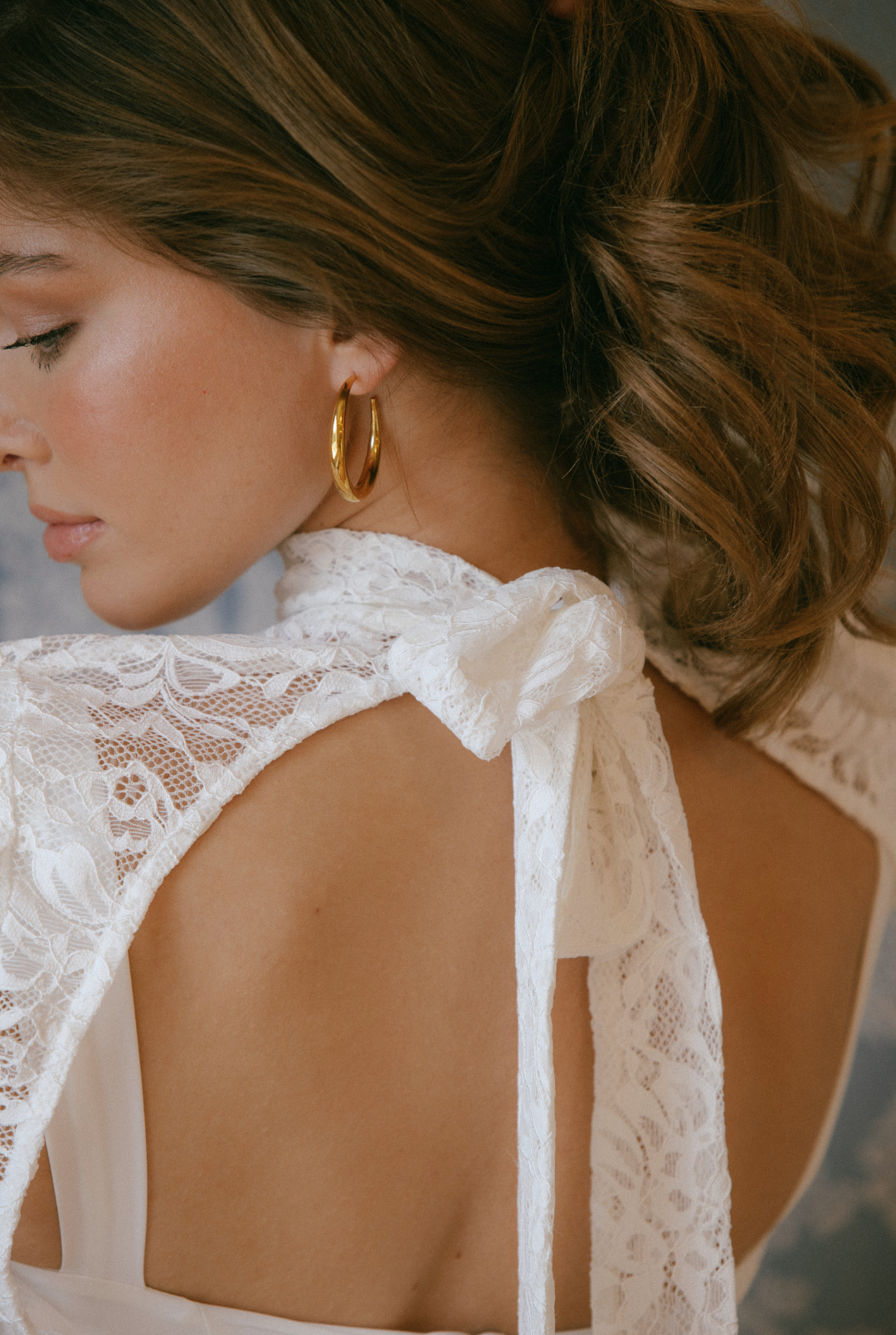 A true staple piece crafted with soft, feminine lace, the Pantelleria dress features an all-over lace design with a high neckline and long, flattering flared sleeves. Delicate scalloped edges and a low scoop back add a romantic and alluring touch, while extended neck ties fasten into an elegant bow.