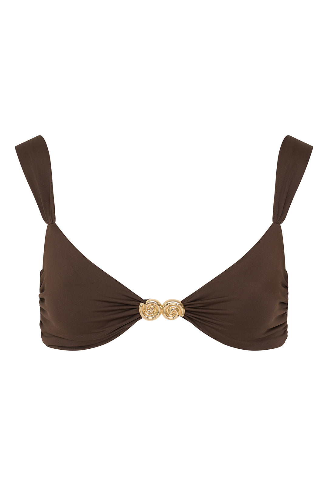 Designed for its elegance and crafted with vintage-inspired gold shell hardware - The Isola Bella Top is a one-of-a-kind balconette that will make you feel instantly elevated. Featuring semi-wide adjustable straps, a tie-up back, and an ultra-flattering cut, this design combines a timeless silhouette with exquisite unique detailing.