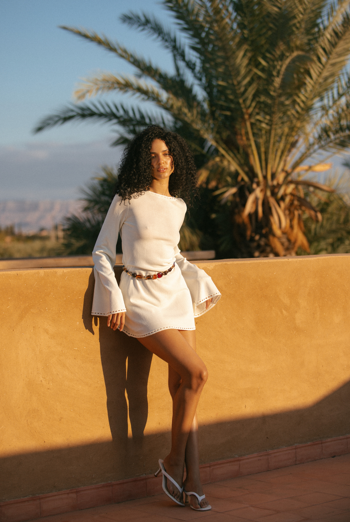 Designed with a fine, soft knit and a loose, effortless silhouette - The Mahe mini dress features long bell sleeves, a boat neckline and an ultra-low scooped back. Complete with adjustable neck ties to hold the dress in place, this dress is perfectly worn loose or styled with a belt. Semi-sheer knit. *Belt in pictures is stylists own.