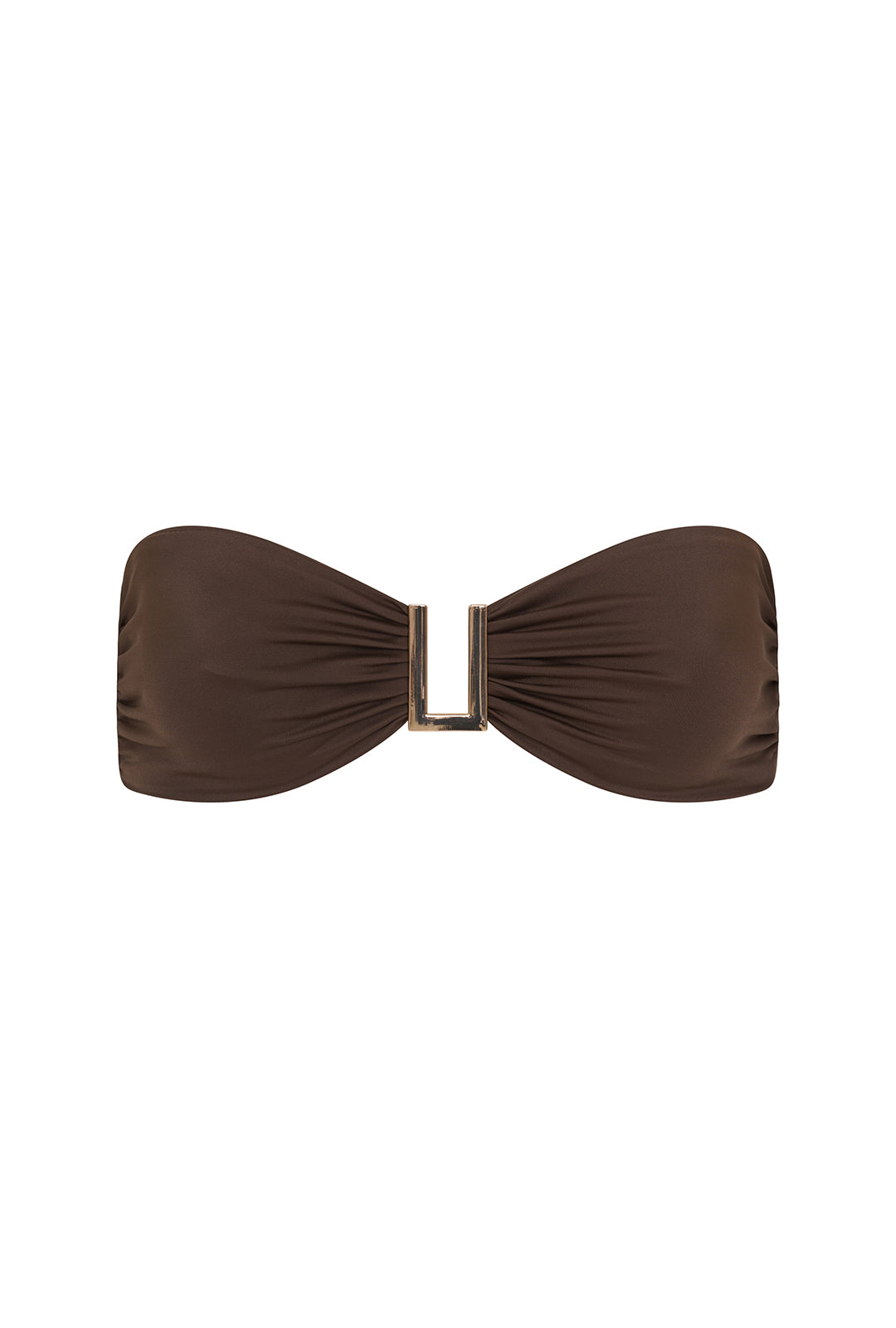 The Taormina top is a simple bandeau adorned with a hint of glamour. Double lined in our eco-friendly nylon, it features an exclusive statement gold U hardware at the centre front with gathered cups and side boning for support. Complete with an adjustable back-ties, this top is perfect for minimal tan lines.